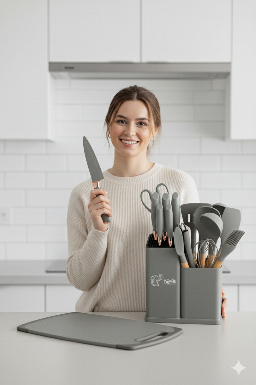 Calidad y Durabilidad Garantizadas: Desde la tabla de cortar hasta el último utensilio, cada pieza está hecha con materiales de alta calidad, libres de BPA y diseñados para durar años.